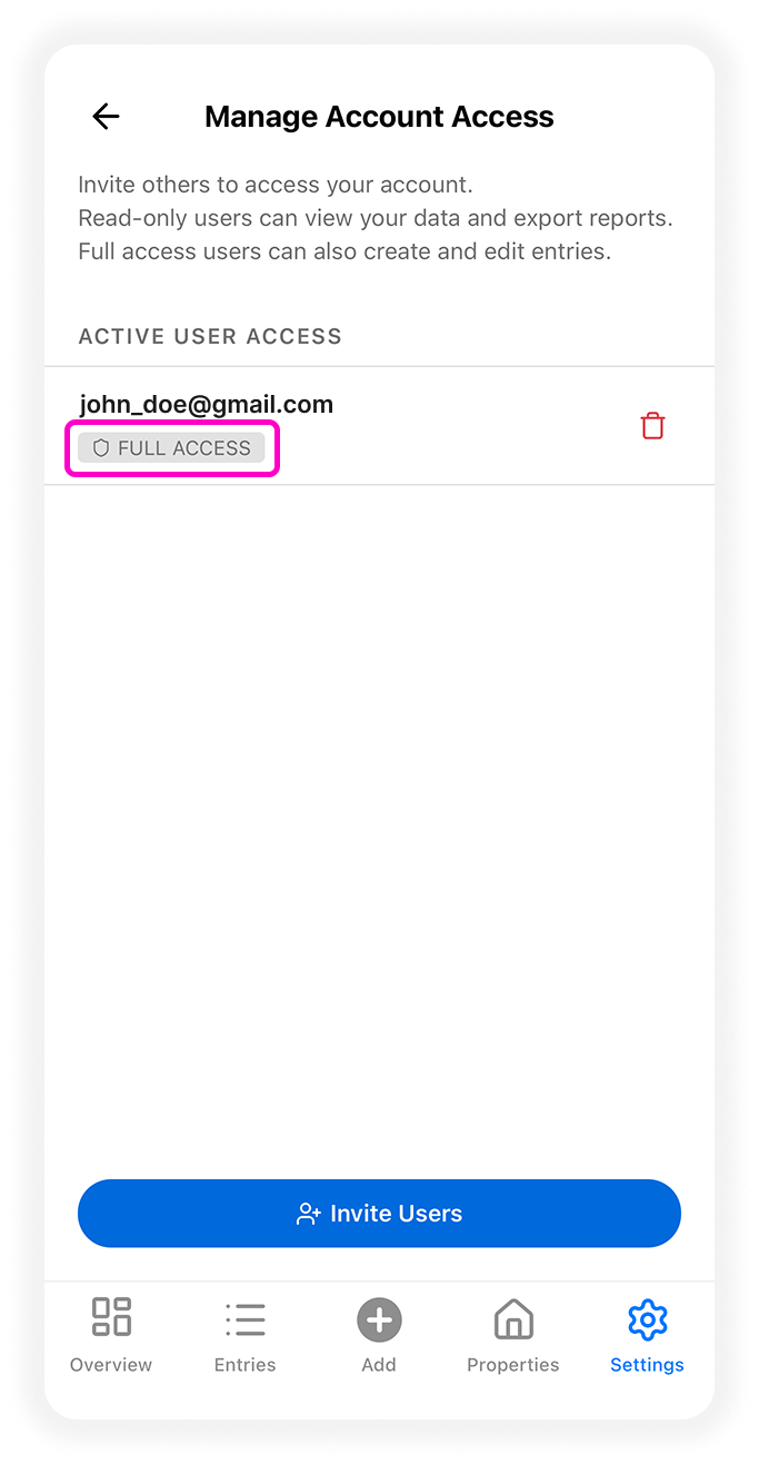 Please note, full access users CANNOT manage your account subscription, delete your account, or share access with other users.